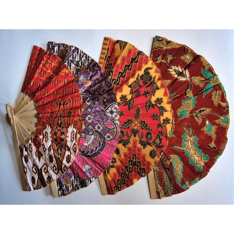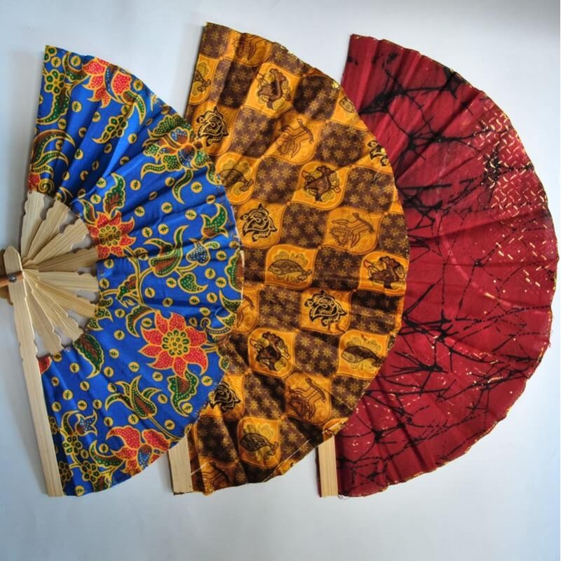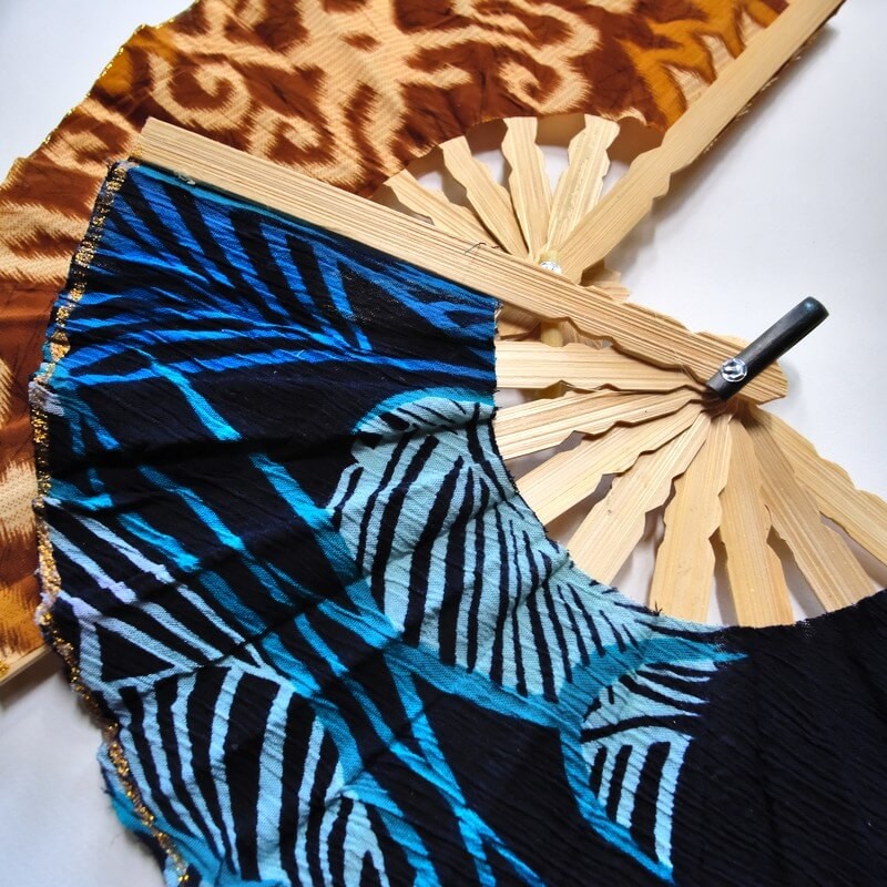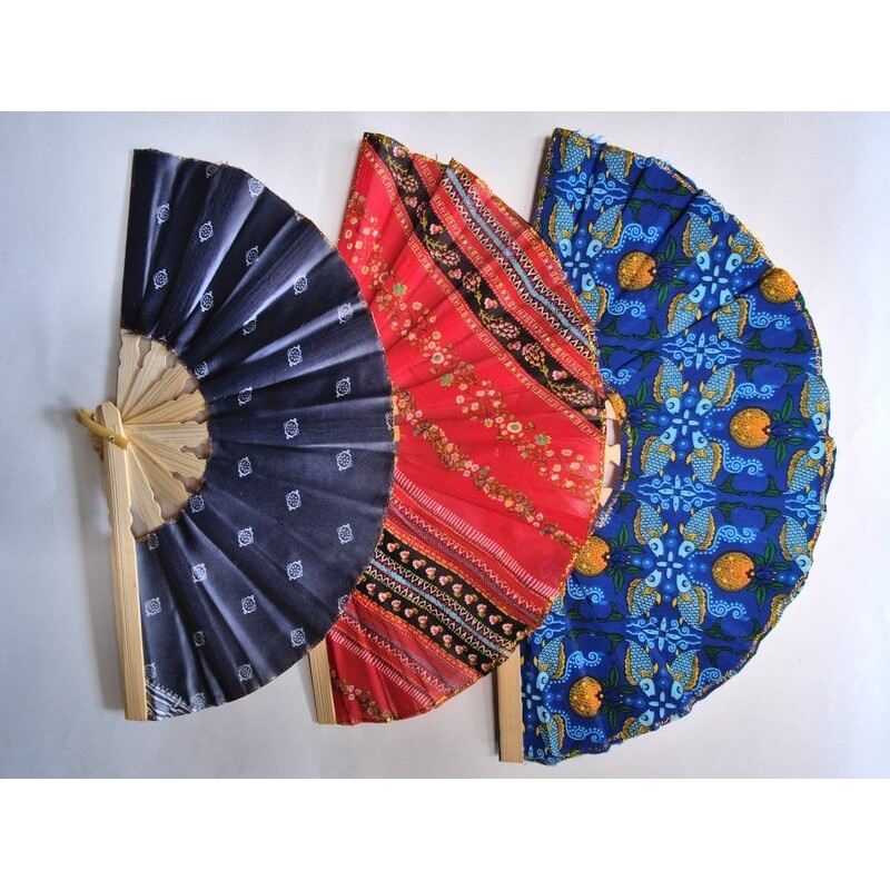 Eventails en bambou et tissu "style Batik" par lot de 100 pièces assorties.