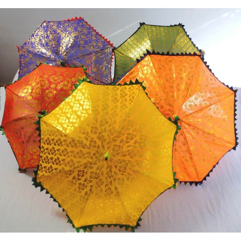 Ombrelles indiennes en tissu coloré. jaune, vert, violet, orange, rouge